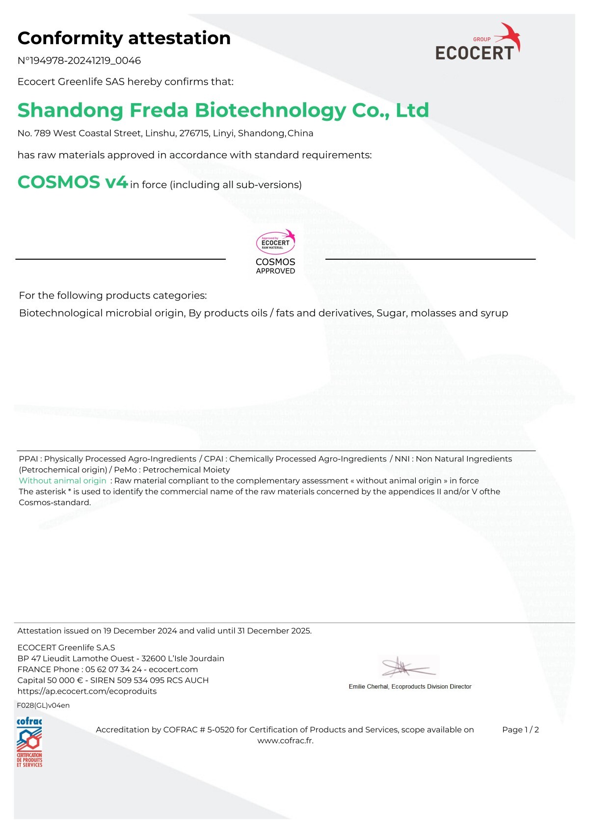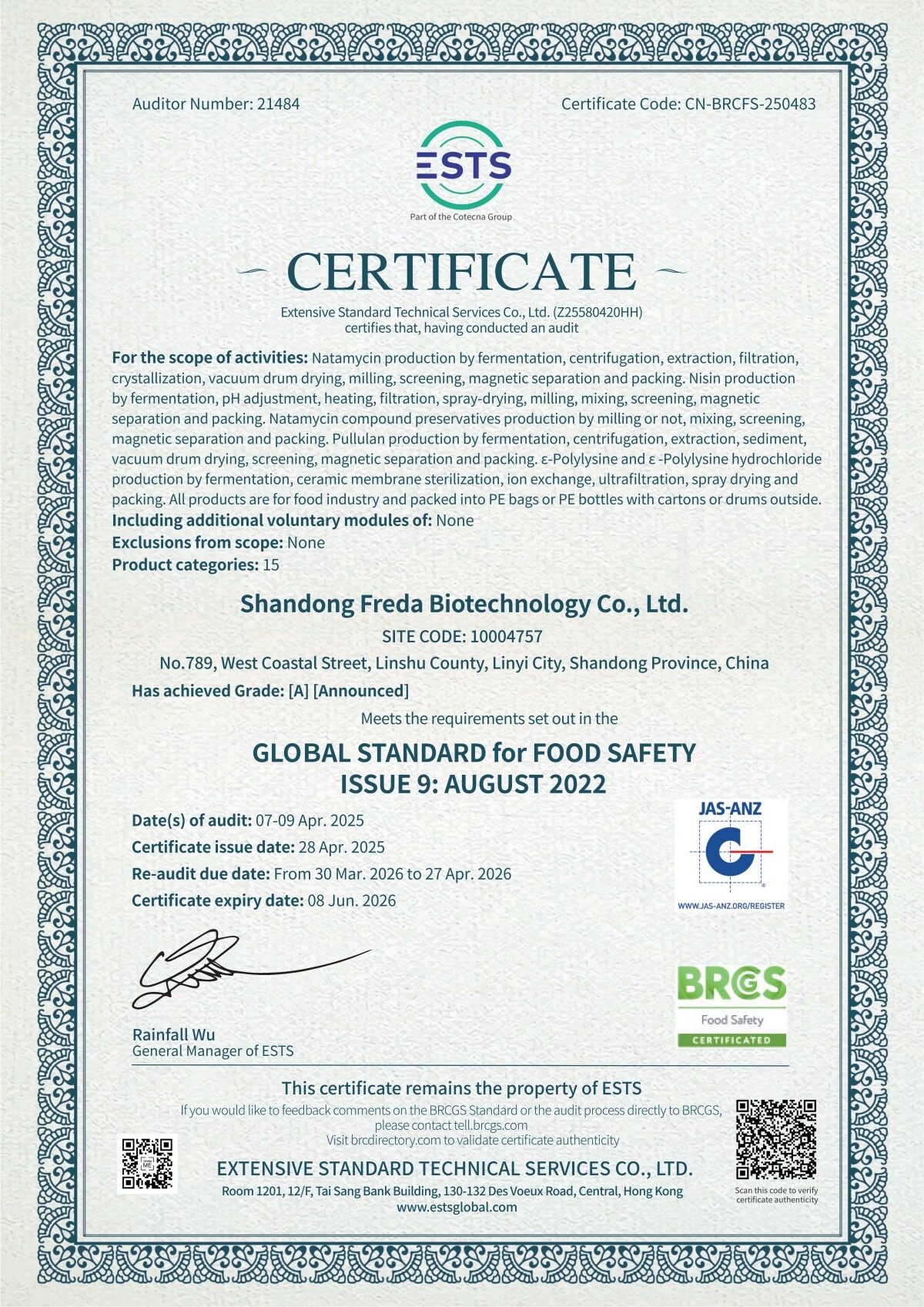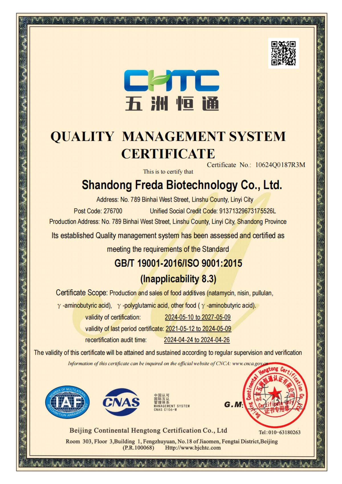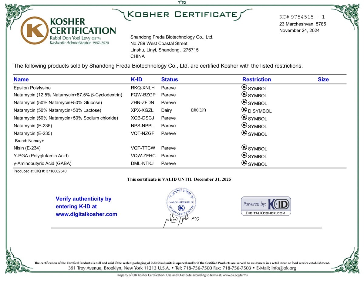 La empresa se adhiere a la calidad del producto como su núcleo y actualmente ha pasado certificaciones como ISO9001, ISO22000, FDA, BRC, KOSHER, HALAL y COSMOS.